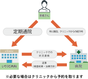 そのような場合、そちらから当院へお手紙をいただき、「普段は当院に受診し処方や状況を確認」→「年数回は大きな病院に受診して検査をしていただく、その際当院での数か月の経過を連絡するお手紙を持参していただく」→「病院の担当の先生から治療方針や次回受診日についてのご返事をいただく」といった形で診療を行っていくことも相談します。